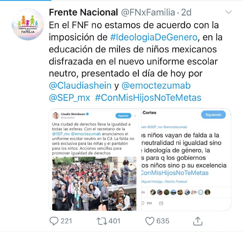 El movimiento Frente Nacional por la Familia fue la primera en pronunciarse en contra de los uniformes neutros, al asegurar que el gobierno de la Ciudad de México pretendía imponer una ideología de género que terminaría confundiendo a los menores de edad.