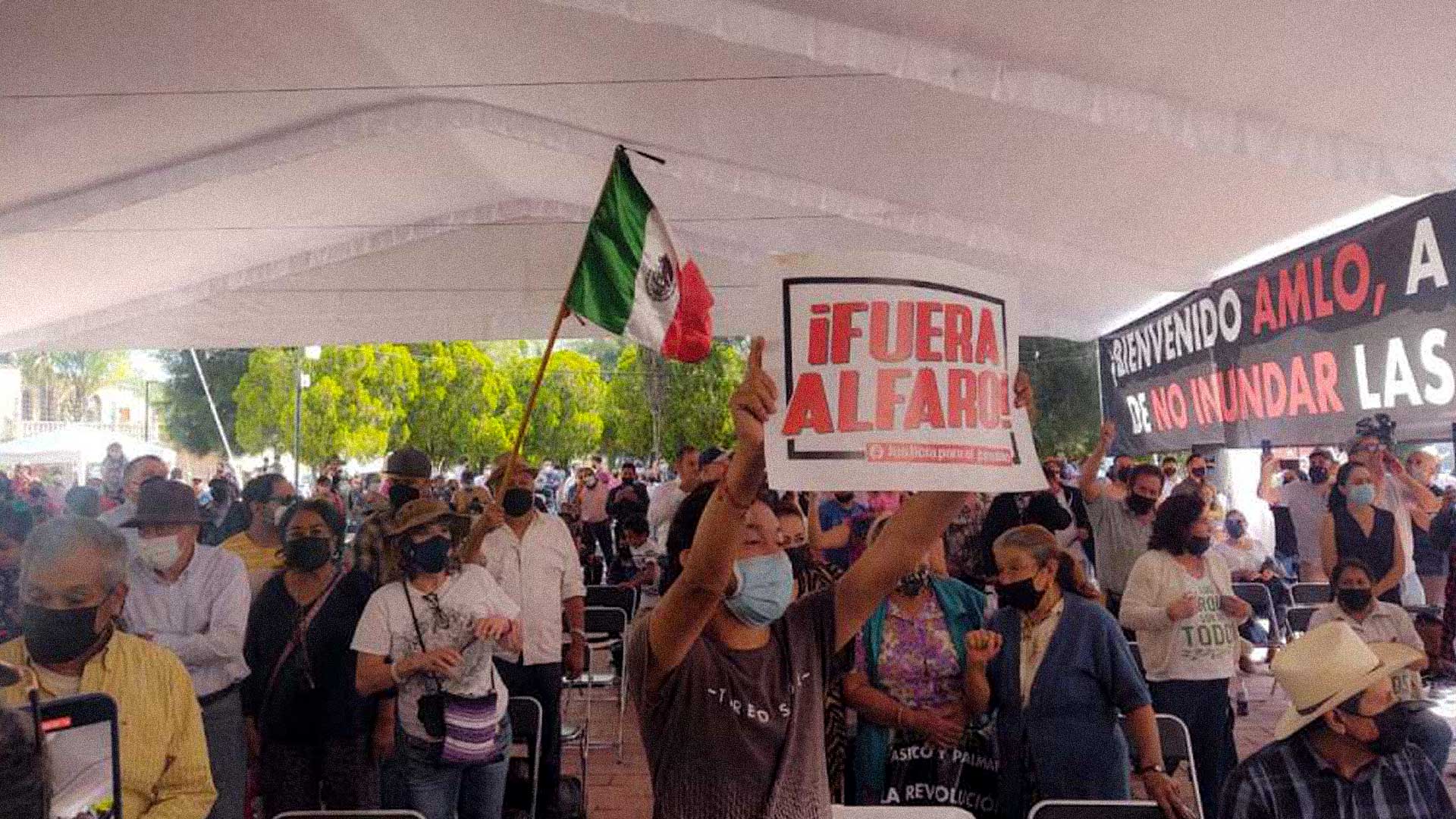 Lo que no fue ficción es cuando llegó Enrique Alfaro Ramírez, gobernador de Jalisco, al pueblo. Corearon a todo pulmón ¡Fuera Alfaro, fuera Alfaro!