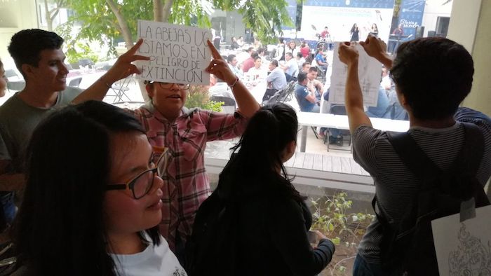 Otro grupo de alumnos atrás de cristal que los dividía colocaban sus pancartas exigiendo más seguridad en todo el campus y en las afueras porque los asaltos contra los alumnos siguen. Una integrante de la mesa de honor se indignó porque se estaba tomando video de la manifestación y salía ella “que no había dado la autorización para grabarla” de la exigencia de seguridad no habló.