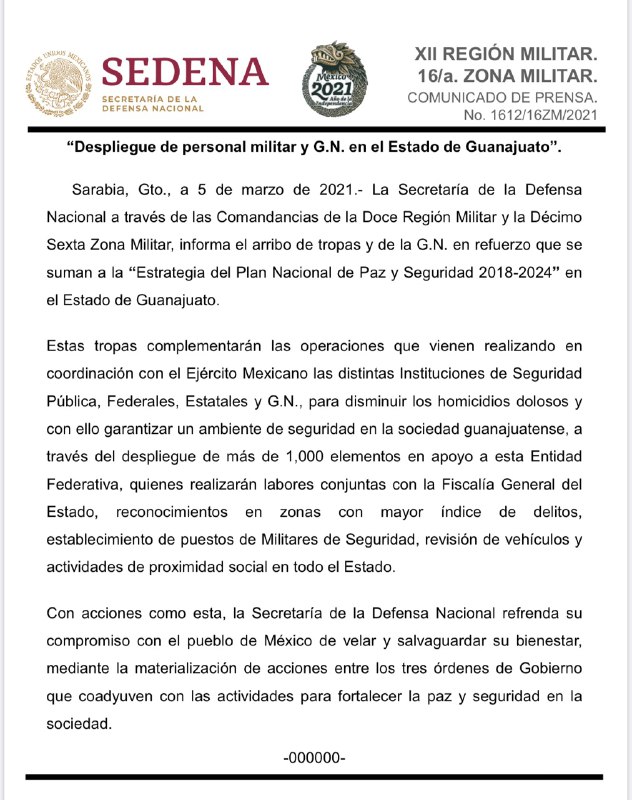 El mismo día que inició el patrullaje aéreo, la Secretaría de la Defensa Nacional (Sedena) dio a conocer la llegada de 1 mil elementos a Guanajuato, para trabajar en coordinación con las autoridades estatales en las zonas con mayor índice de delitos con el establecimiento de puestos militares para la revisión de vehículos y actividades de proximidad.