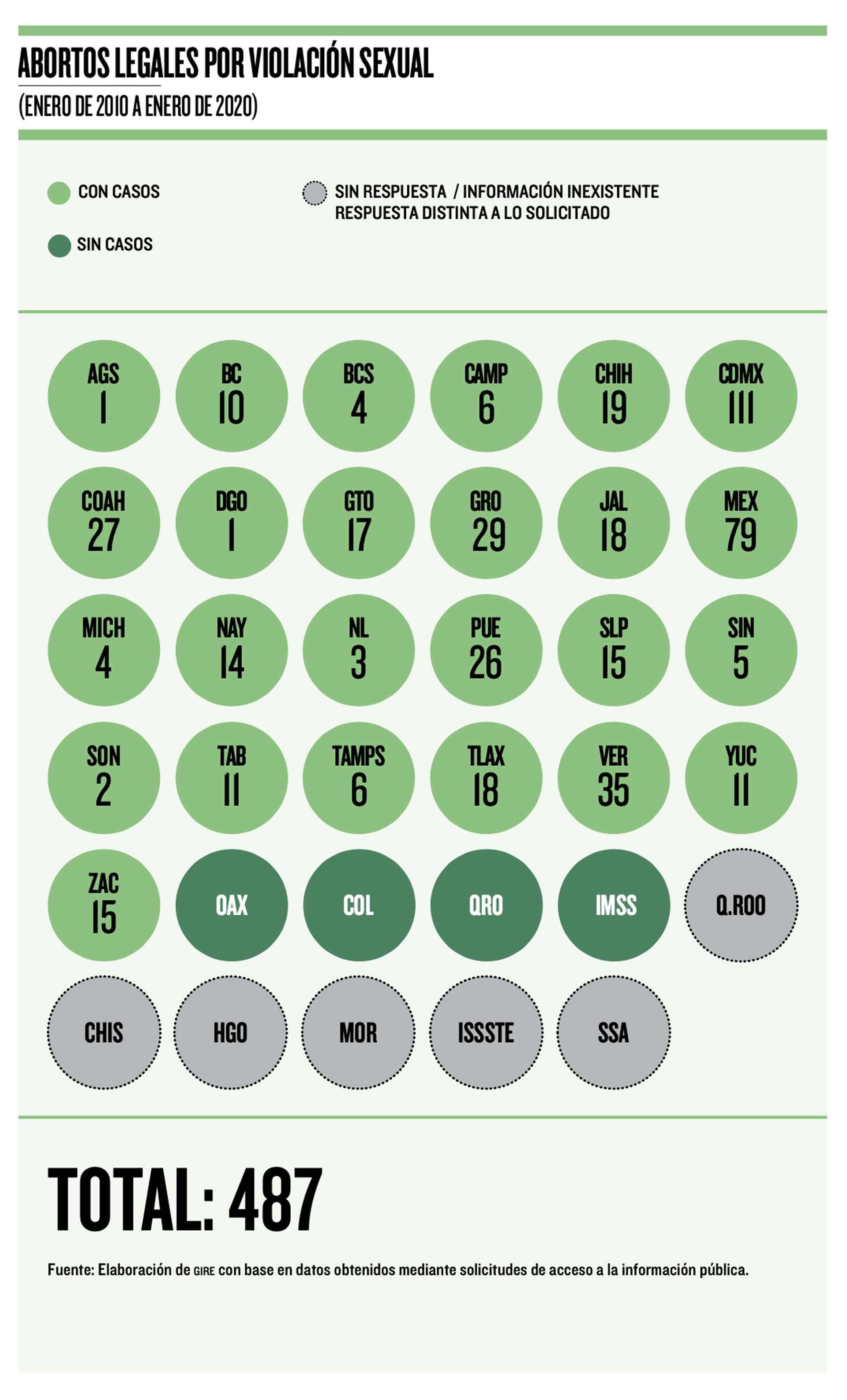 De acuerdo con registros de GIRE, de enero de 2010 a enero de 2020, en Guanajuato se realizaron 17 abortos a mujeres víctimas de una violación. Sin embargo, el Instituto de Salud Pública del Estado informó sobre al menos 36 solicitudes de 2017 a 2021. Las solicitudes se concentraron en los hospitales maternos de León, Celaya, Irapuato y San Luis de la Paz. Se registraron pacientes desde los 11 y hasta los 39 años de edad.