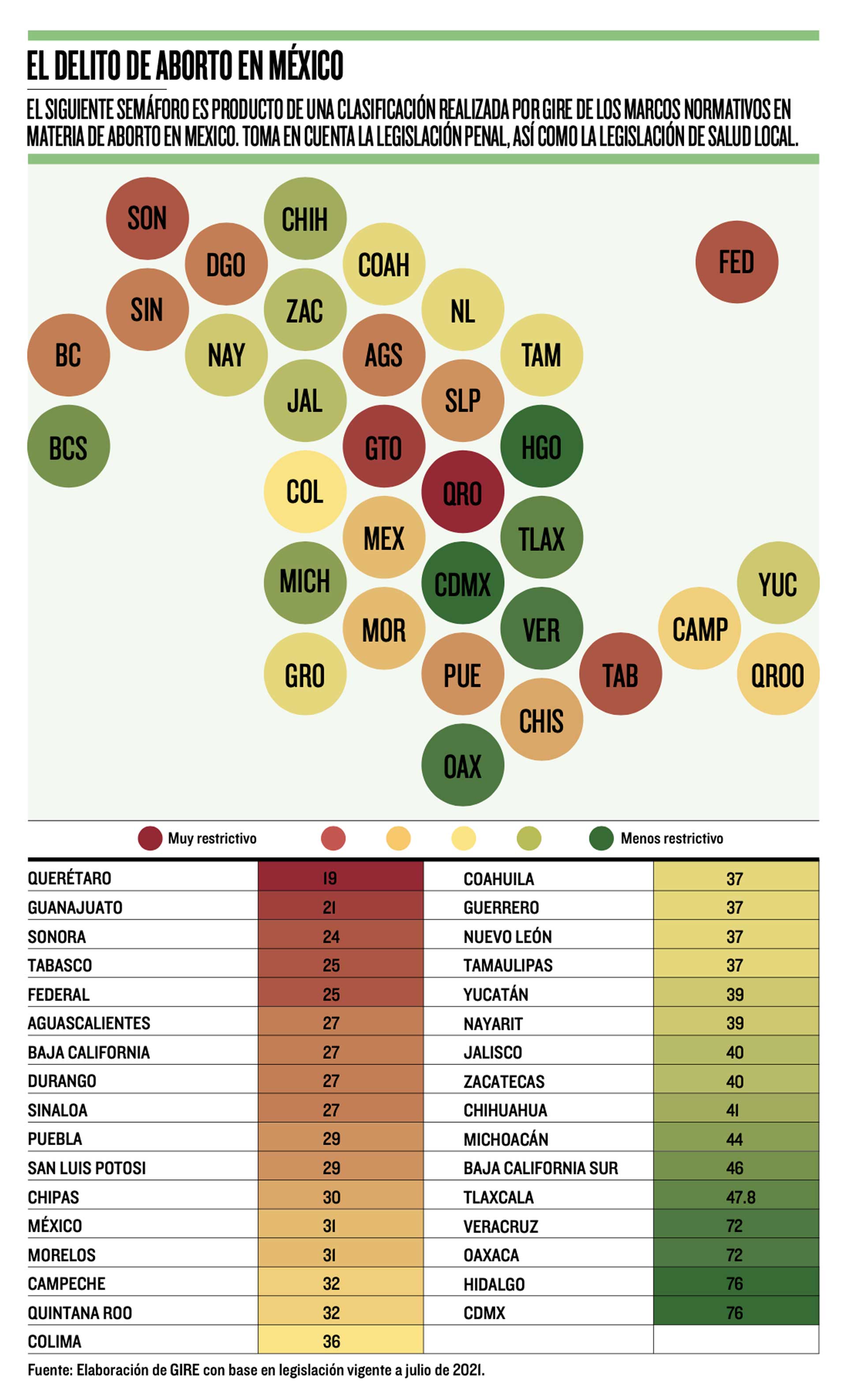 De acuerdo con GIRE, Guanajuato es uno de los estados que tiene las normas más restrictivas relacionadas con el tema, pues la interrupción del embarazo solo está exenta de sanción en caso de violación o por hechos imprudenciales o culposos. Pero sí ameritan sanción otras seis causales como: situaciones de salud, alteraciones genéticas o congénitas graves en el producto, peligro de muerte, inseminación artificial, causas económicas y voluntad de la mujer.