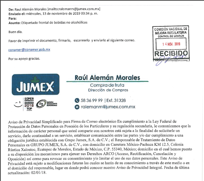 Como ejemplo de ello, POPLab ya documentó la presión ejercida por Nestlé de México a sus empleados. Por su parte, Jumex hizo lo propio con sus proveedores, pues varios de ellos mandaron a la CONAMER comentarios, que en realidad eran copias del archivo que les envió Raúl Alemán Morales, de la Dirección de Compras; como se puede constatar porque hubo quienes añadieron el correo enviado por el propio Morales. (mando por correo el PDF sugiero eliminar de la imagen, si la ponen, al productor que comete el error)