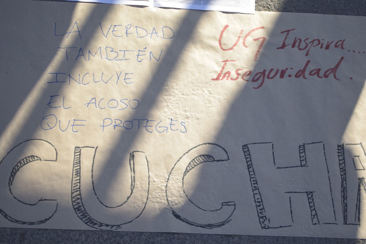 "Todo por tu podrido prestigio", "No estamos todas, nos falta Daniela", "¿Orgullo UG?", "Es violencia institucional" fueron algunos de los mensajes que se podían leer, mientras unos 60 estudiantes montaban guardia.