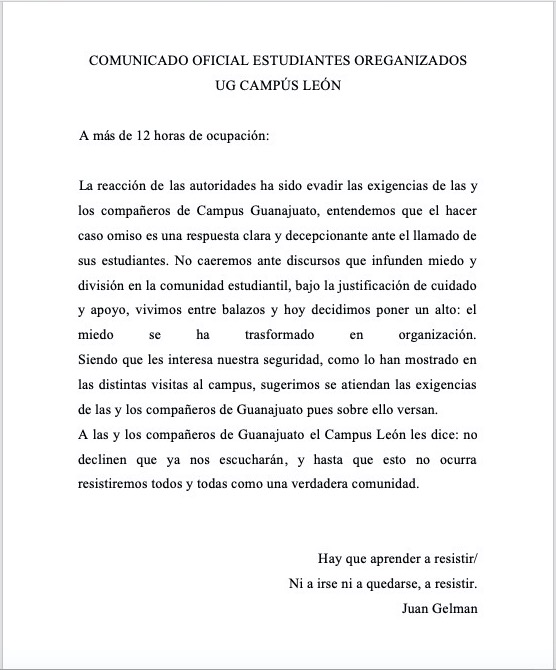 "A más de 12 horas de ocupación", los alumnos y alumnas inconformes se mantuvieron unidos y esta noche, la comunidad del campus León emitió un comunicado donde menciona que "la reacción de las autoridades ha sido evadir las exigencias" planteadas en el Campus Guanajuato, "entendemos que el hacer caso omiso es una respuesta clara y decepcionante ante el llamado de sus estudiantes" a la exigencia de seguridad.
