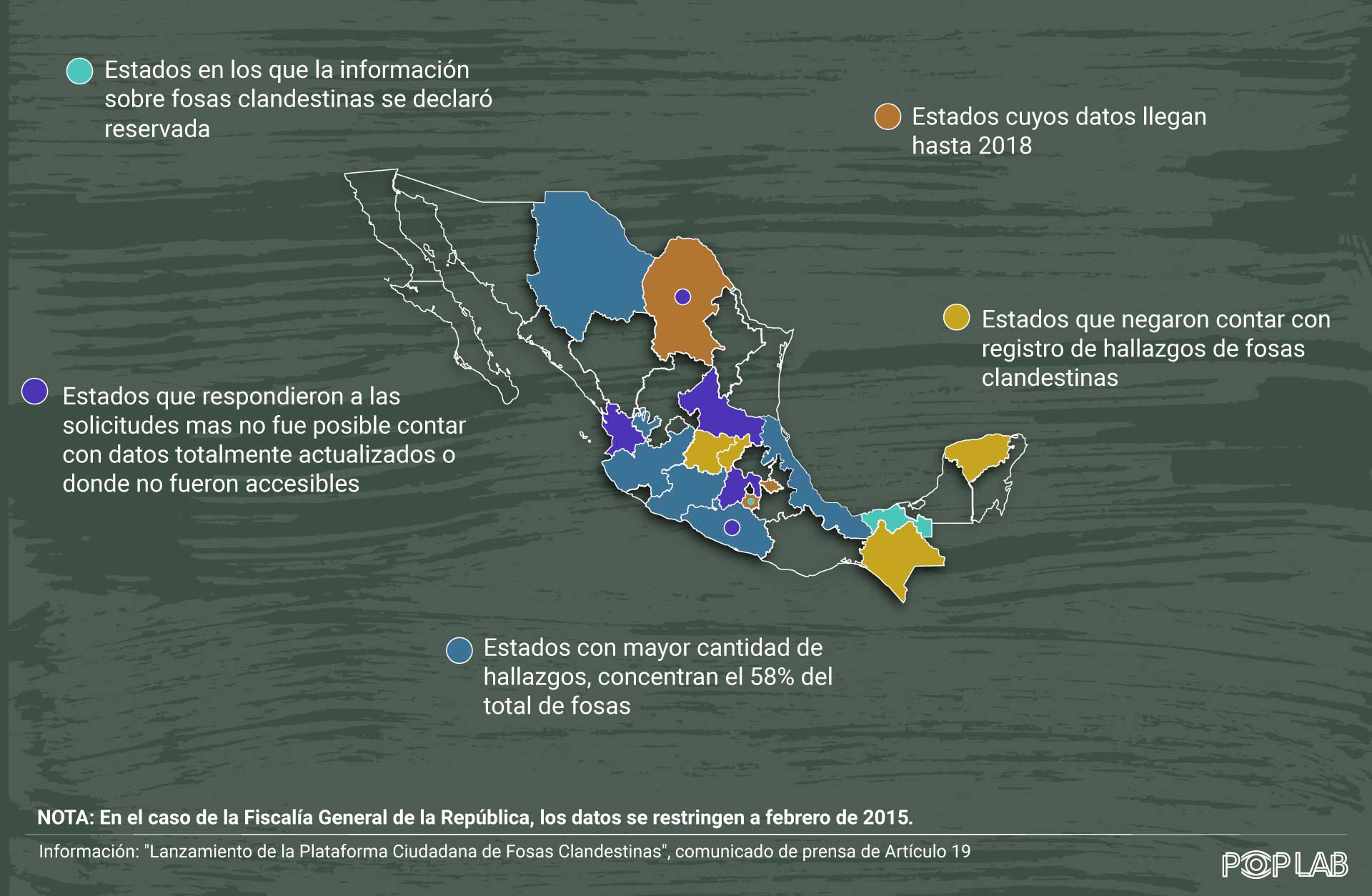 Esta información procede de la nueva Plataforma Ciudadana de Fosas Clandestinas, presentada por la organización Artículo 19 oficina México-Centroamérica, la cual reúne documentación de los hallazgos de fosas reportadas por la prensa nacional y local, así como datos obtenidos de las fiscalías o procuradurías estatales y la Fiscalía General de la República vía solicitudes de transparencia, con el objetivo de contribuir a cubrir ese vacío de información derivado de la falta de una versión pública del Registro Nacional de Fosas, responsabilidad de la FGR y fiscalías.