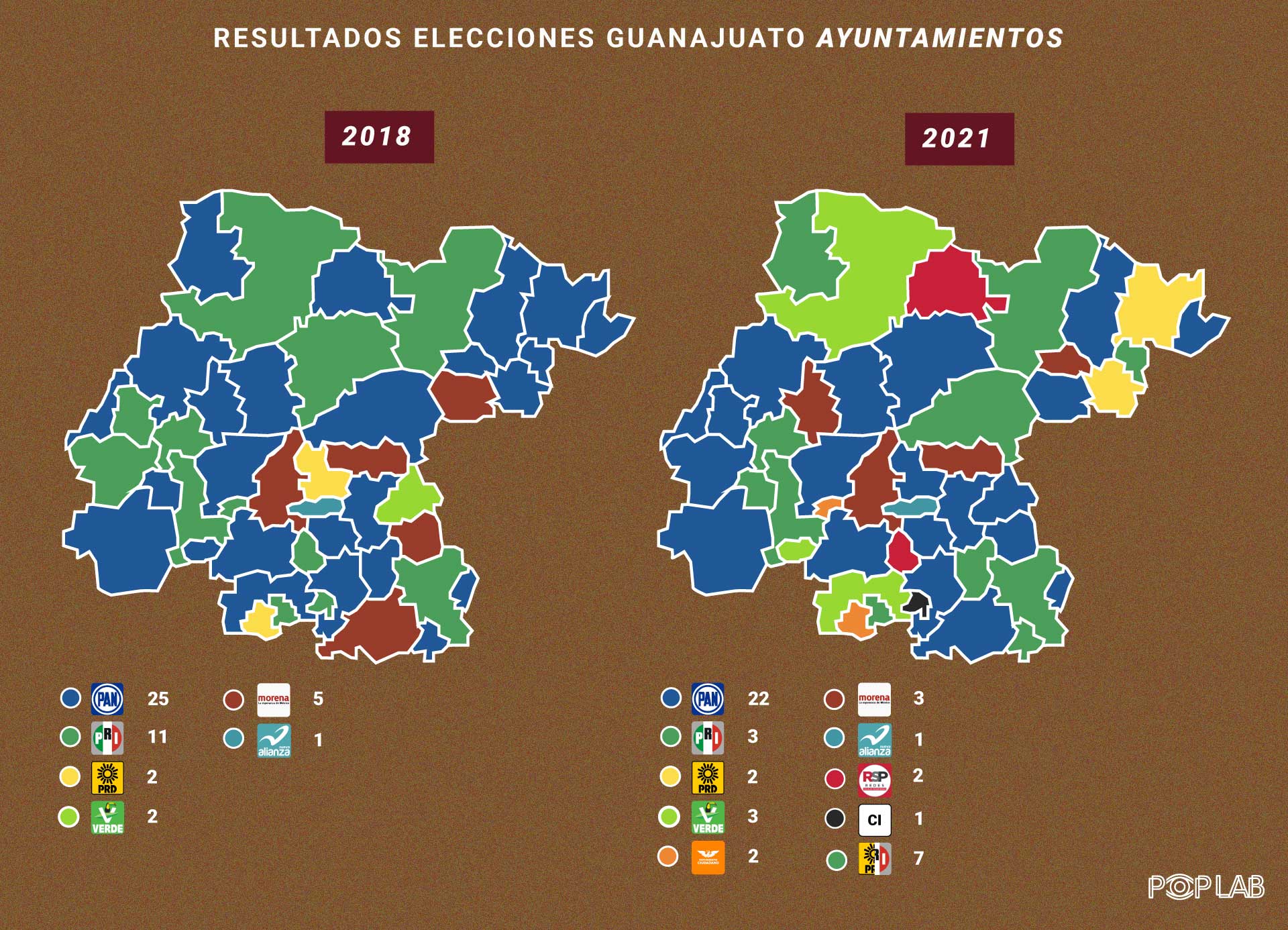 La elección de 2021 trajo consigo una reconfiguración del mapa político de Guanajuato, con la llegada de nuevos partidos a los gobiernos municipales y la disminución de las fuerzas que han gobernado hasta ahora. También, la paridad de género tendrá un avance importante al aumentar significativamente el número de ciudadanos que serán gobernados por mujeres.