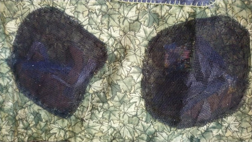 ¿Cómo representar entonces las fosas? Lo hice sobre una tela verde como eran los campos cultivados en Guanajuato e hilvanando un tul negro que cubre retazos de telas que pueden verse, pero no con nitidez. Son jirones que resultan en formas abultadas que parece que quieren romper esa barrera, como los cuerpos que quieren ser encontrados.