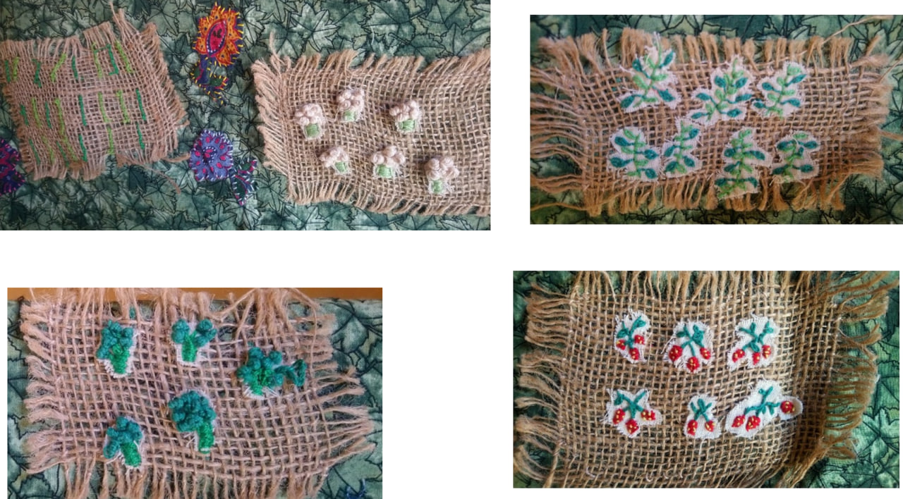 Para mí, el bordado ha sido una forma de acompañar a las buscadoras y estar acompañada frente a esta tragedia social pues como bien dice Cordelia Rizzo “esta memoria que se exige a través del bordado es tanto de la pérdida de las víctimas directas como la del sufrimiento que le produce a la sociedad en general que ve trastocadas sus certezas y sus estilos de vida”[1]. En este acompañar bordando y bordar acompañando me inspiré para elaborar esta pieza que incluye la frase “Este campo nos alimentaba, ahora aquí nos buscan” y que está en el Recetario para la Memoria de Guanajuato[2].