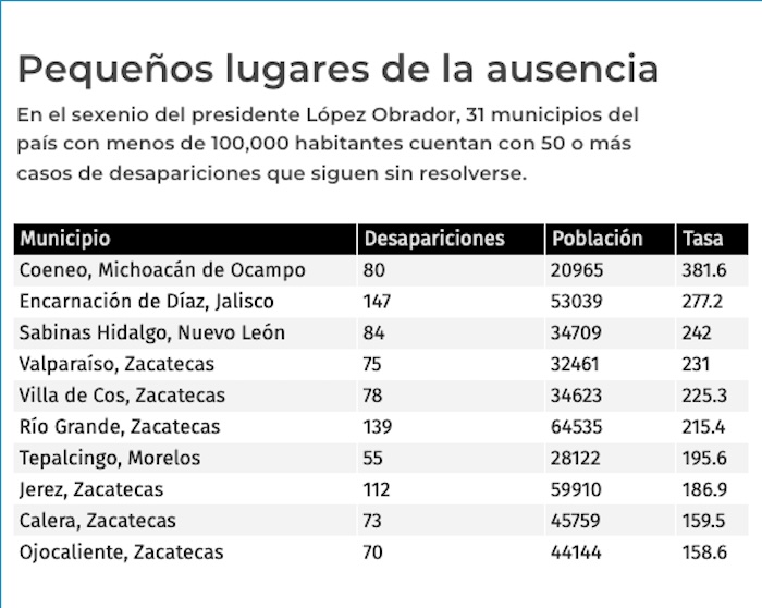 A dónde van los desaparecidos elaboró una lista de municipios con menos de 100,000 habitantes que reportaron 50 o más desapariciones desde el inicio del sexenio lopezobradorista para estimar la tasa de desapariciones activas, es decir, las personas que continúan sin ser localizadas. Las tasas permiten mostrar un problema que muchas veces queda invisibilizado: en municipios escasamente poblados también ocurre esta tragedia y puede, incluso, generar impactos más graves.
