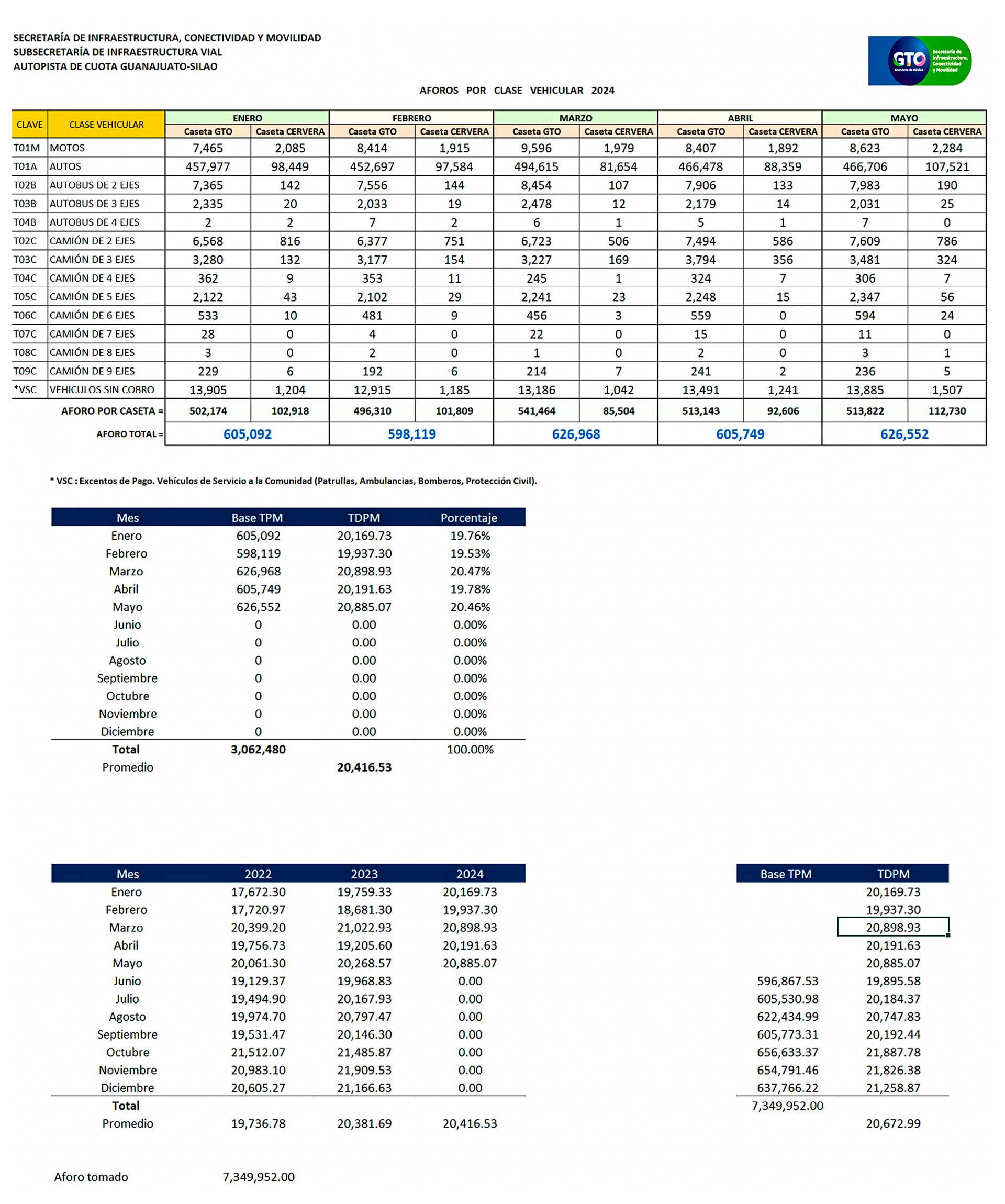 De acuerdo a los aforos presentados por SICOM, la autopista Guanajuato-Silao cerró 2023 con un tráfico diario promedio de 20 mil 381 vehículos. Las proyecciones entregadas a los compradores de las bases prevén un crecimiento a 24 mil 877 vehículos en 2030; 34 mil 852 en 2040 y cierra en 45 mil 800 en 2055, cuando vence la concesión.