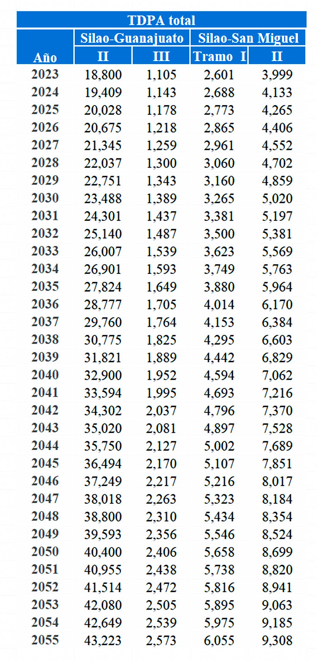 Sin embargo, las previsiones son muy inferiores para la nueva carretera Silao-San Miguel: de 6 mil 600 vehículos contabilizados en 2023 subiría a 8 mil 285 en 2030; 11 mil 656 en 2040 y concluir la concesión en 2055 con 15 mil 363 autos y camiones al día.