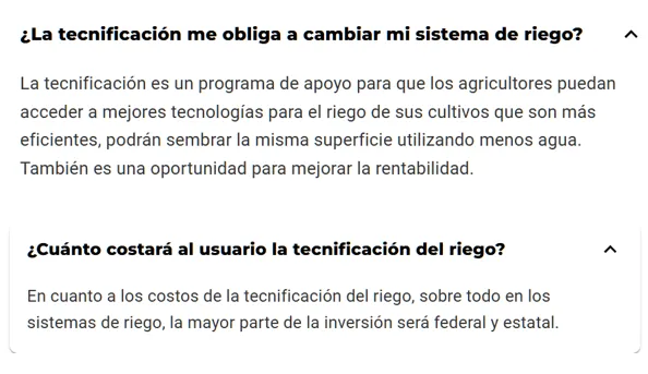 Si consultamos, por ejemplo, la página oficial Agua para la gente[1], su sección de preguntas frecuentes tiene respuestas tan enigmáticas como evasivas, por ejemplo, algo tan básico e importante como: ¿Cuánto costará al usuario la tecnificación del riego? Respuesta: En cuanto a los costos de la tecnificación del riego, sobre todo en los sistemas de riego, la mayor parte de la inversión será federal y estatal.