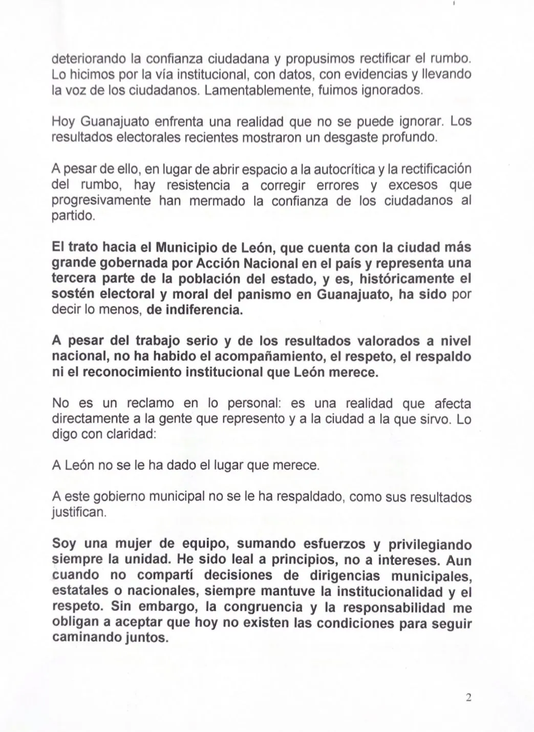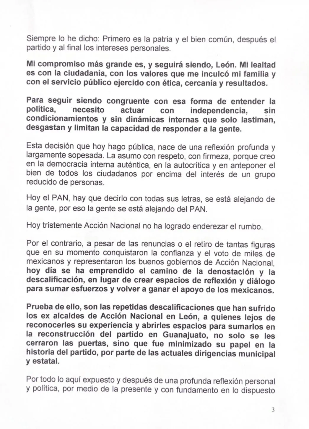 “Hoy el PAN se está alejando de la gente, por eso la gente se está alejando del PAN. (...) Hoy día se ha emprendido el camino de la denostación y la descalificación, en lugar de crear espacios de reflexión y diálogo para sumar esfuerzos y volver a ganar el apoyo de los mexicanos. Prueba de ello, son las repetidas descalificaciones que han sufrido los ex alcaldes de Acción Nacional en León, a quienes lejos de reconocerles su experiencia y abrirles espacios para sumarlos en la reconstrucción del partido en Guanajuato, no sólo se les cerraron las puertas, sino que fue minimizado su papel en la historia del partido, por parte de las actuales dirigencias municipal y estatal”, señala el escrito.