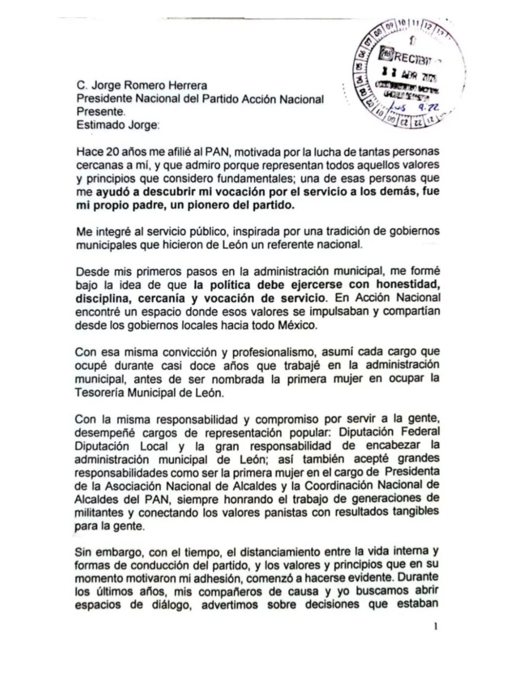 En su carta de renuncia dirigida a Jorge Romero Herrera y recibida por el CEN a las 9:22 de esta mañana, Alejandra Gutiérrez expuso su necesidad de actuar con independencia y sin condicionamientos ni dinámicas internas “que limiten la capacidad de responder”. La edil afirmó que la decisión de renunciar fue resultado de un proceso de reflexión tras sentirse desplazada e ignorada por parte de su dirigencia, así como una falta de entendimiento con los valores e ideas que hoy ejercen los liderazgos del partido.