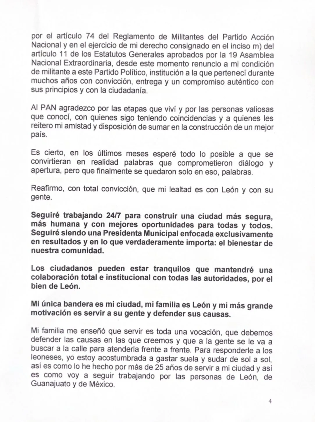 “Renuncio porque llevo años aguantando lo ataques del poder, renuncio porque han hecho todo lo posible por descarrilar nuestro gobierno, renuncio porque convirtieron al PAN en un instrumento que está dañando a León, renuncio porque es evidente que quienes lo dirigen perdieron el rumbo y no están dispuestos a corregirlo”, afirmó en un video que fue replicado en sus redes sociales.