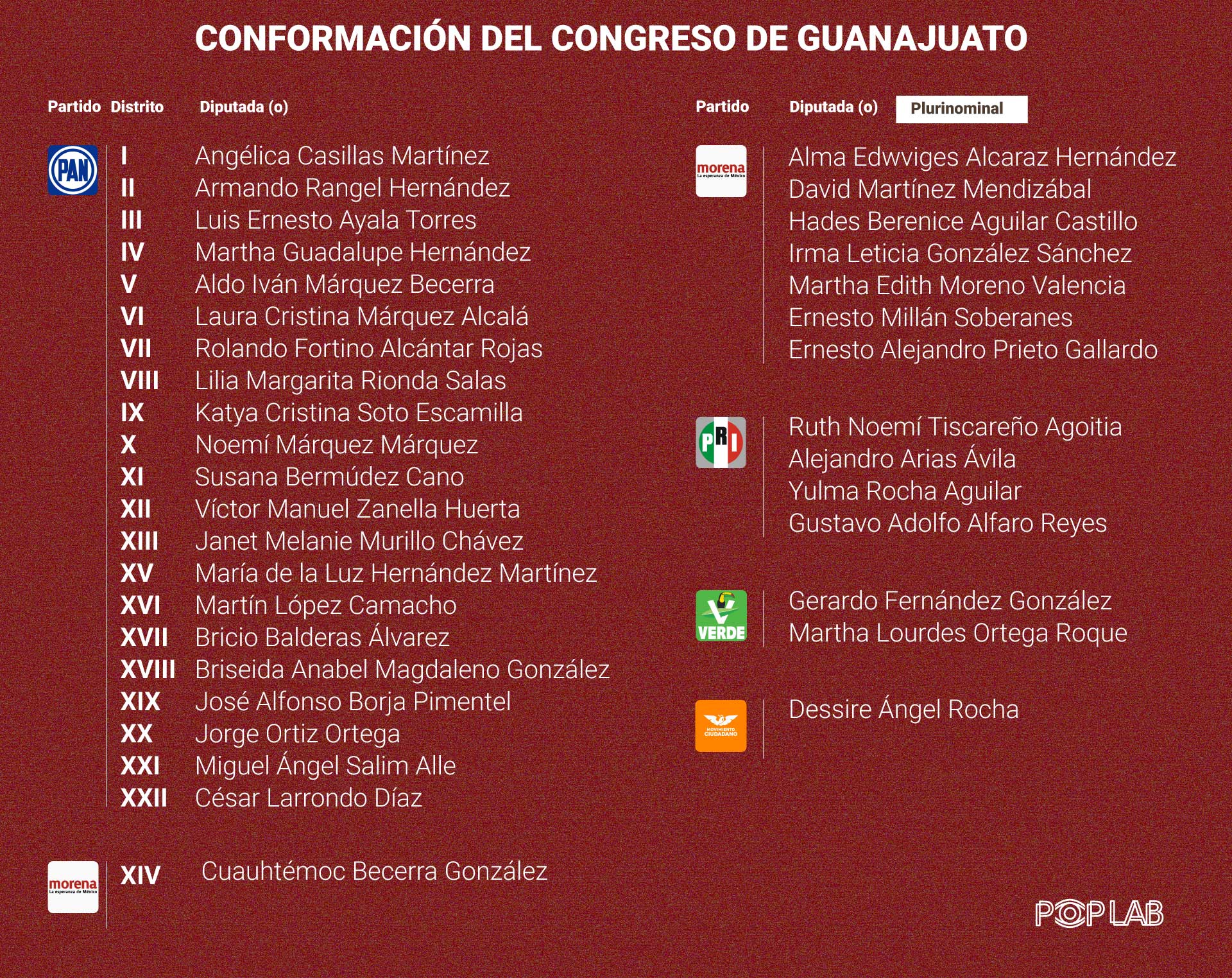 Con las asignaciones de las diputaciones plurinominales, el PAN mantiene la mayoría al ganar 21 de los 22 distritos de mayoría relativa, triunfo que lo deja fuera del reparto de representación proporcional. Morena llegará con una bancada de ocho diputadas y diputados: un distrito ganado y siete plurinominales, tres espacios más que al arranque de la actual Legislatura. El PRI conserva cuatro curules, el PVEM dos y Movimiento Ciudadano uno. Se quedan fuera del Legislativo local el PRD y Nueva Alianza.