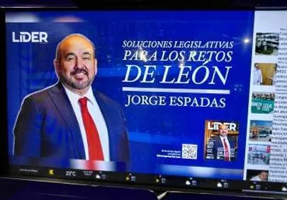 “Soluciones legislativas para los retos de León”, enuncia la portada de la “edición especial” del mes de marzo de la revista Líder Empresarial, en la que aparece la imagen del diputado local Jorge Espadas Galván. El contenido de la entrevista es exclusivo para suscriptores, la portada con la foto del coordinador de la bancada del PAN en el Congreso aparece en al menos una decena de espectaculares en la zona urbana de León.
