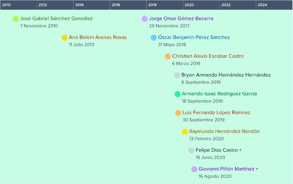 En esta línea del tiempo puede observarse que Buscadoras ya encontró a Giovanni y a Felipe, pero sigue en búsqueda de al menos 9 personas más: casos de larga data como los de José Gabriel y Ana Belem, sucedidos mucho antes de la crisis de violencia en la entidad y del surgimiento de normativas y políticas en la materia, o casos que están por cumplir 5 años como el de Jorge Omar, en el que se presume la participación de cuerpos policiacos, lo que ha motivado al Comité de la ONU contra las desapariciones forzadas, a activar el mecanismo de Acciones Urgentes.