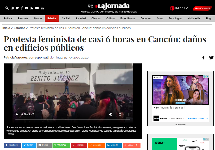En una nota publicada el 15 de noviembre por el diario “La Jornada” bajo el siguiente título “Protesta feminista de casi 6 horas en Cancún; daños en edificios públicos”, el enfoque de la noticia es sobre los daños a los edificios. En un solo párrafo se menciona el por qué de la marcha, sin embargo, el discurso sobre los edificios dañados permanece sobre el por qué de la manifestación.