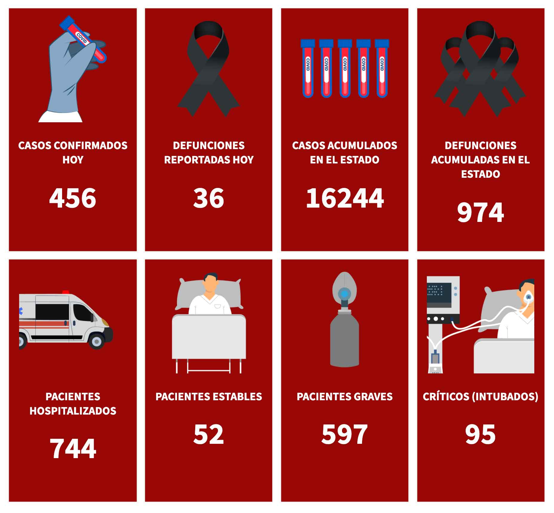 Este sábado sumaron 456 pacientes confirmados a COVID-19 y 36 muertes en las últimas 24 horas, de acuerdo con la Secretaría de Salud del Estado.