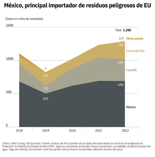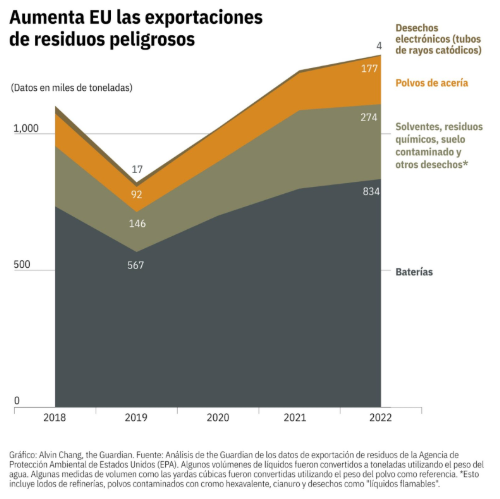 Los datos muestran que en 2022 las compañías de Estados Unidos exportaron casi 1.3 (1.27) millones de toneladas de residuos peligrosos, en contraste con 1.1 millones de 2018.