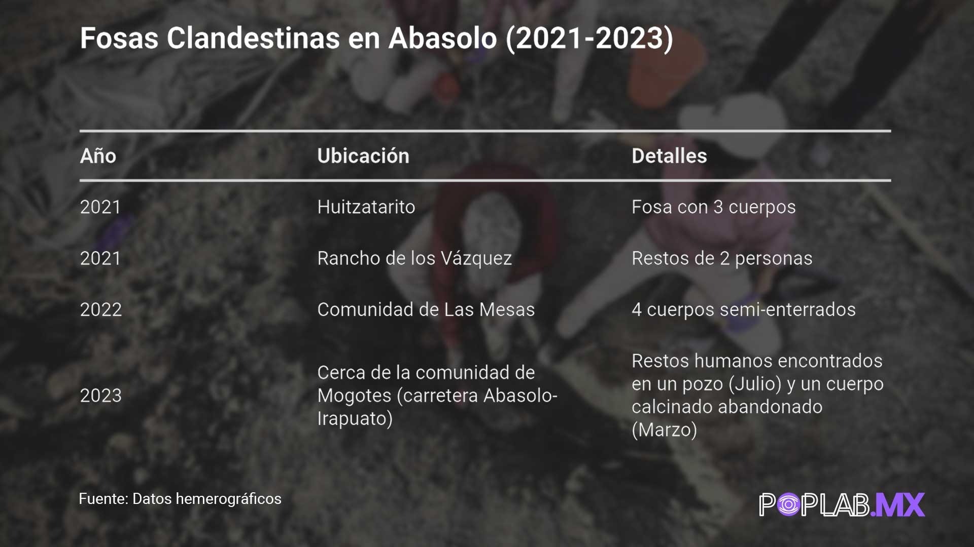Los últimos sitios de ocultamiento masivo fueron ubicados en Abasolo, donde en un primer punto a principios de mayo se recuperaron restos óseos pertenecientes a unas 21 personas en el patio de una casa del Residencial Campestre Los Álamos. Pero de ese mismo lugar, en el 2021 la Fiscalía General de Guanajuato exhumó al menos 11 cuerpos.