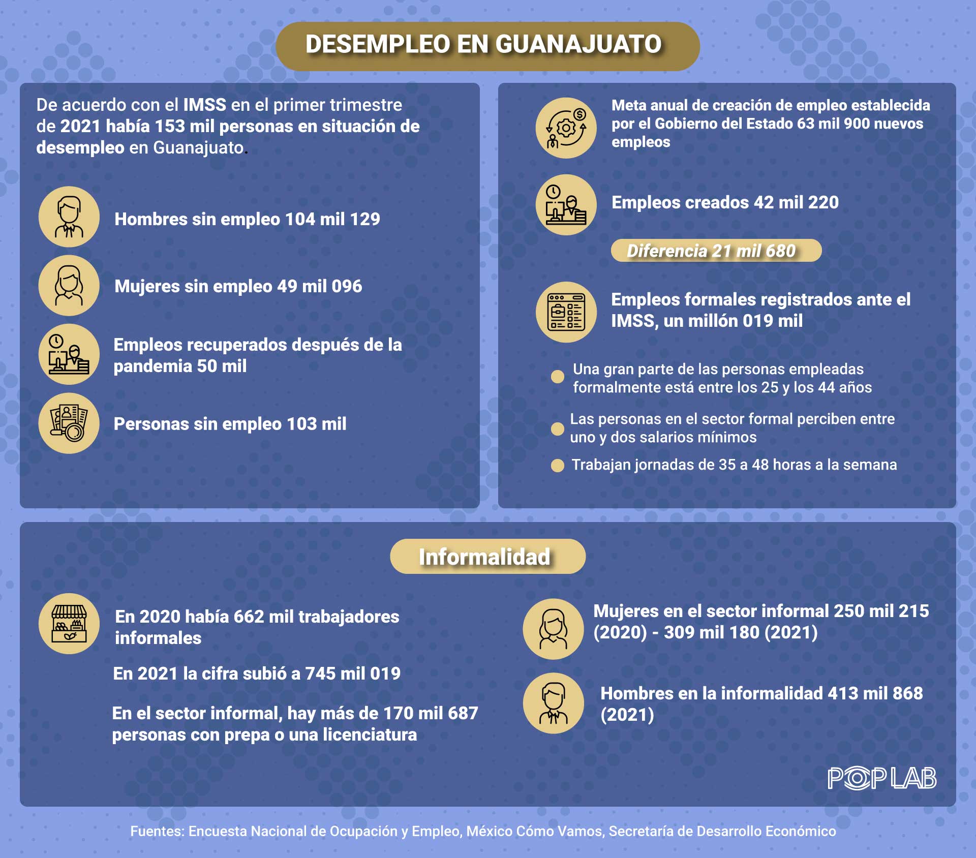 En el primer trimestre de 2021, de acuerdo con datos del Instituto Nacional de Estadística y Geografía (INEGI) en Guanajuato había 153 mil 225 personas en situación de desempleo; 104 mil 129 eran hombres y 49 mil 096 eran mujeres. Sin embargo, datos del Instituto Mexicano del Seguro Social (IMSS) refieren que durante el 2021 se recuperaron 50 mil empleos perdidos durante la pandemia por el COVID-19.