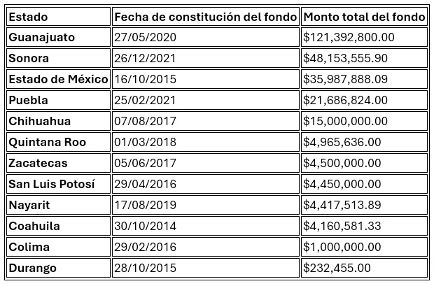 Los estados con Fondo constituido, pero de los cuales no pudo obtenerse información sobre los montos asignados fueron: Aguascalientes, Baja California, Baja California Sur, Campeche, Ciudad de México, Guerrero, Hidalgo, Jalisco, Michoacán, Morelos, Nuevo León, Querétaro, Sinaloa, Tabasco, Tamaulipas, Tlaxcala, Veracruz y Yucatán. Preocupan especialmente los casos de Chiapas y de Oaxaca que no cuentan con Fondos instituidos legalmente.