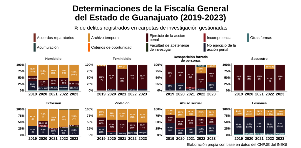 Este relevo es una oportunidad para presentar los resultados de la gestión de los últimos 15 años. En esta investigación, procesamos y analizamos información pública de los Censos Nacionales de Procuración de Justicia Estatal (CNPJE) y la Encuesta Nacional de Victimización y Percepción sobre Seguridad Pública (ENVIPE), ambas del Instituto Nacional de Estadística y Geografía (INEGI), así como los datos del Secretariado Ejecutivo del Sistema Nacional de Seguridad Pública (SESNSP), para ofrecer un panorama completo de la gestión de la fiscalía, haciendo particular énfasis en las principales fallas y las deficiencias. Los homicidios son solo una parte de los múltiples problemas de impunidad y falta de justicia que enfrentan las y los guanajuatenses; por eso, es necesario poner un acento en las deficiencias que, sin importar la persona que sea elegida, deben atenderse.