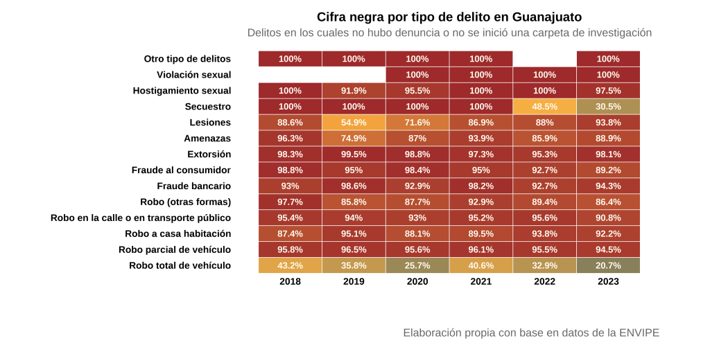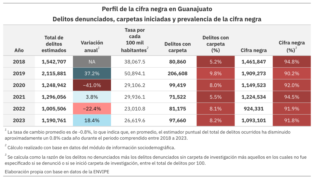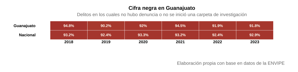Es notable que la cifra negra en Guanajuato se haya mantenido alineada al promedio nacional durante el periodo entre 2018 y 2023. Este patrón, sumado al modesto incremento en la proporción de delitos que derivan en carpetas de investigación, plantea interrogantes adicionales sobre la efectividad del modelo de procuración de justicia: ¿por qué Guanajuato mantiene consistentemente una cifra negra cercana al promedio nacional a pesar de contar con uno de los liderazgos más estables al frente de la fiscalía? ¿En qué medida la continuidad en la gestión ha contribuido a normalizar niveles de impunidad cercanos a la media nacional? La convergencia entre los indicadores estatales y nacionales sugiere que un liderazgo de 15 años no fue un factor relevante para reducir la brecha entre delitos estimados y denuncias formales. Esto apunta a la presencia de otros factores, como la gestión de la fiscalía, que han perpetuado esta brecha.