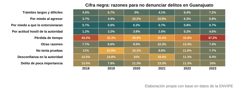 Una posible explicación puede surgir de las razones para no denunciar delitos. En Guanajuato pareciera haber una crisis de confianza institucional que se ha profundizado durante el periodo analizado. La principal respuesta de las personas consultadas sobre las razones para no denunciar es que lo consideran como una pérdida de tiempo. Esta razón aumentó de 43.2% en 2018 a 47.2% en 2023; por su parte, la percepción de trámites largos y difíciles creció del 4.5% al 7.2%. Estas dos respuestas sugieren una percepción consolidada: denunciar no solo es ineficaz, sino que implica un costo emocional y de tiempo que las víctimas no están dispuestas a asumir.