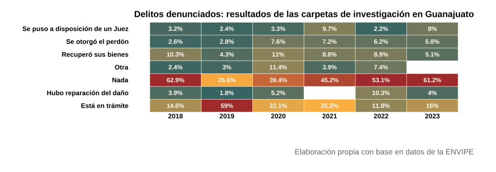 La evolución de los resultados en las carpetas de investigación confirma el deterioro sistemático en la procuración de justicia. El porcentaje de casos en los que «no pasó nada» osciló entre 62.9% en 2018 y 61.2% en 2023, aunque en 2019 se reportó una breve mejora (26.6%) que no logró sostenerse. Es decir, que en al menos tres de cada cinco casos investigados por las autoridades no hubo ningún resultado. Mientras tanto, los casos que llegaron ante un juez se mantuvieron persistentemente bajos: entre 2.2% y 9.7%.