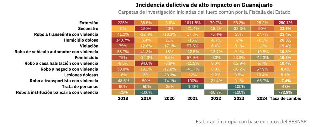 Los patrones de incidencia delictiva de alto impacto revelan otra dimensión en el deterioro en la procuración de justicia. En la siguiente gráfica, es posible ver el cambio en el número de carpetas abiertas por delito con respecto al año anterior, expresado en porcentaje. La extorsión fue el delito con más cambios año con año: en promedio fue de 290% (ver última columna: Tasa de cambio). Aunque en menor proporción, otros delitos violentos también reportan variaciones significativas entre 2018 y 2024, como secuestro, con 23.9% en promedio por año; robo a transeúnte con violencia, con 23.4%; y homicidio doloso, con 20.3%.