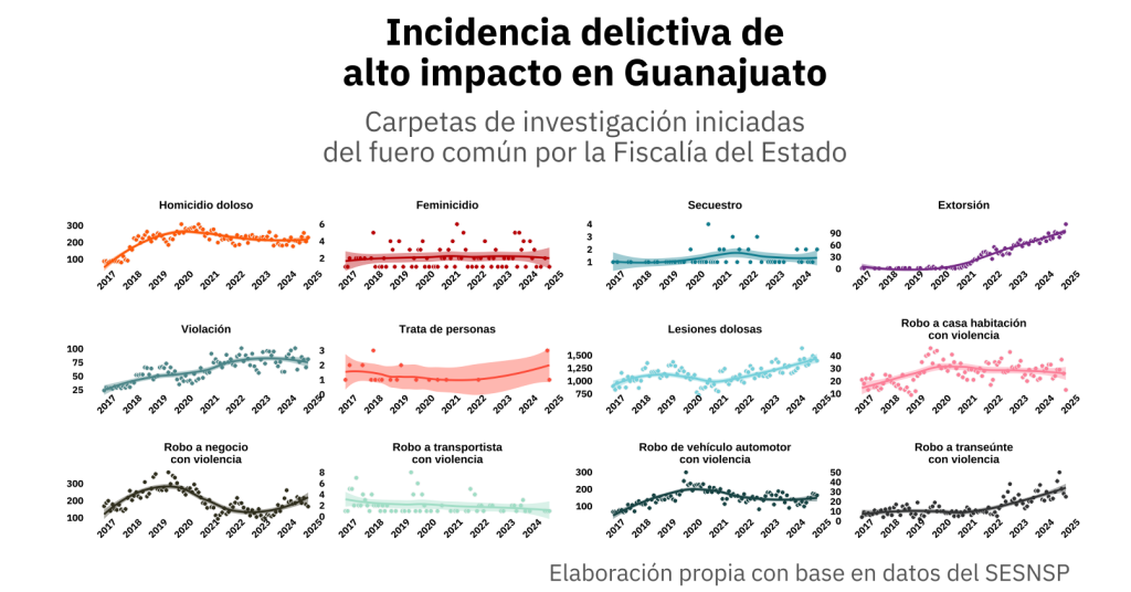 Algunos delitos como el homicidio doloso exhibe trayectorias ascendentes sostenidas desde 2017, mientras que otros como feminicidio y secuestro muestran variaciones significativas. Este comportamiento sugiere posibles inconsistencias en su clasificación y registro. En favor de esta hipótesis está la estabilidad relativa en delitos como lesiones dolosas. Sin embargo, es importante considerar que es posible que exista un subregistro de denuncias a partir de un mayor miedo al agresor y la percepción de hostilidad por parte de las autoridades. El comportamiento de estos delitos sugiere que la continuidad en el liderazgo de la Fiscalía no se tradujo en resultados efectivos para contener la escalada de violencia. Todo lo contrario, pareciera haber contribuido a la normalización de patrones delictivos cada vez más graves.