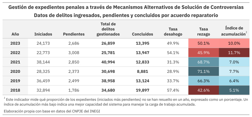 - Los Mecanismos Alternativos de Solución de Controversias (MASC), lejos de ofrecer una salida más ágil de justicia, replicaron los mismos problemas del sistema tradicional: su tasa de rezago es de 50% en 2023.