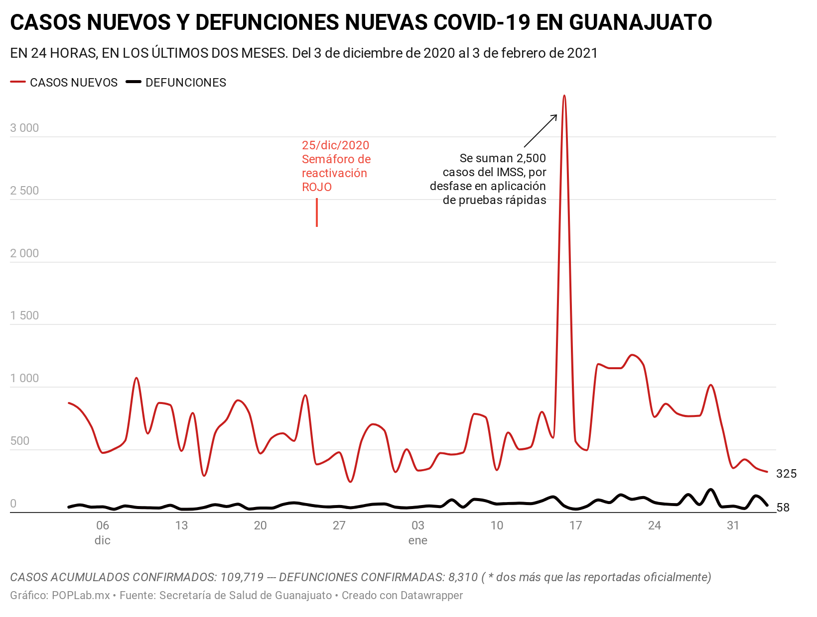 Al primero de febrero, la Secretaría de Salud reportó el 62.6% de la capacidad hospitalaria con 1,519 camas ocupadas y disponibles, 907. En cuanto a los contagios, Guanajuato reportó 109 mil 719 casos confirmados y 8 mil 308 defunciones.