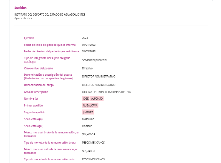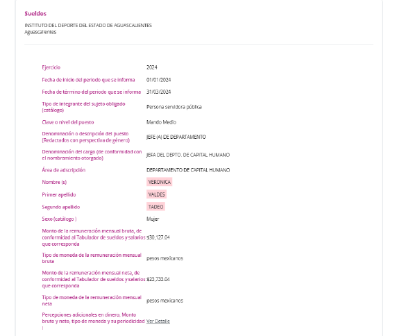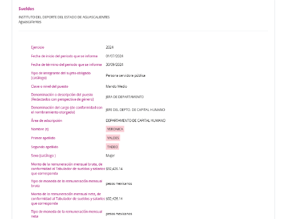 Por su parte, el gobierno estatal y el Instituto del Deporte de Aguascalientes (IDEA) también se han negado a dar alguna explicación por el cargo y salario de Verónica Valdés Tadeo, una de las exconcursantes, quien, de acuerdo con transparencia, fue jefa del Departamento de Capital Humano en el IDEA, donde en algunos meses de 2024 cobró un salario bruto mensual superior a los 94 mil pesos, una cifra muy por encima de lo establecido en el tabulador de sueldos del Instituto para un cargo de esa jerarquía.
