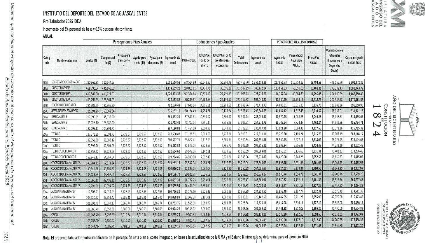 Pese a ser licenciada en negocios gastronómicos por la Universidad Panamericana, Valdés Tadeo, de 24 años, se desempeñaba como jefa del Departamento de Control Humano en el Instituto del Deporte de Aguascalientes (IDEA). En dicha dependencia, pasó de percibir un salario bruto mensual de 30 mil 127 pesos en 2023, a 92 mil 426 pesos brutos al mes entre julio y septiembre de 2024, una remuneración que está muy por encima de lo que tabulador de sueldos del Instituto estipula para este 2025, que es de 31 mil 263 pesos al mes para un puesto de jefatura de departamento, ya incluyendo un aumento de entre el 3 y el .5% en los salarios con respecto a 2024. Esa información se encuentra en el Paquete Económico estatal de este año.