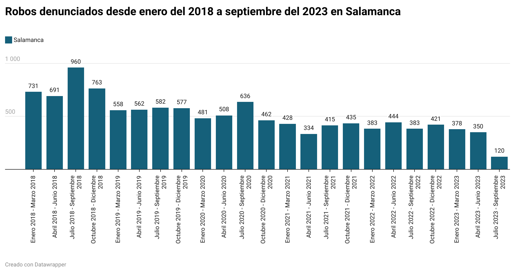 De acuerdo con Data México del gobierno federal, en el mes de julio del presente en Salamanca se presentaron 507 denuncias por delitos, de las cuales la mayoría fueron por robo, con 120; otras 80 más por diversos delitos del fuero común, 73 por violencia familiar.