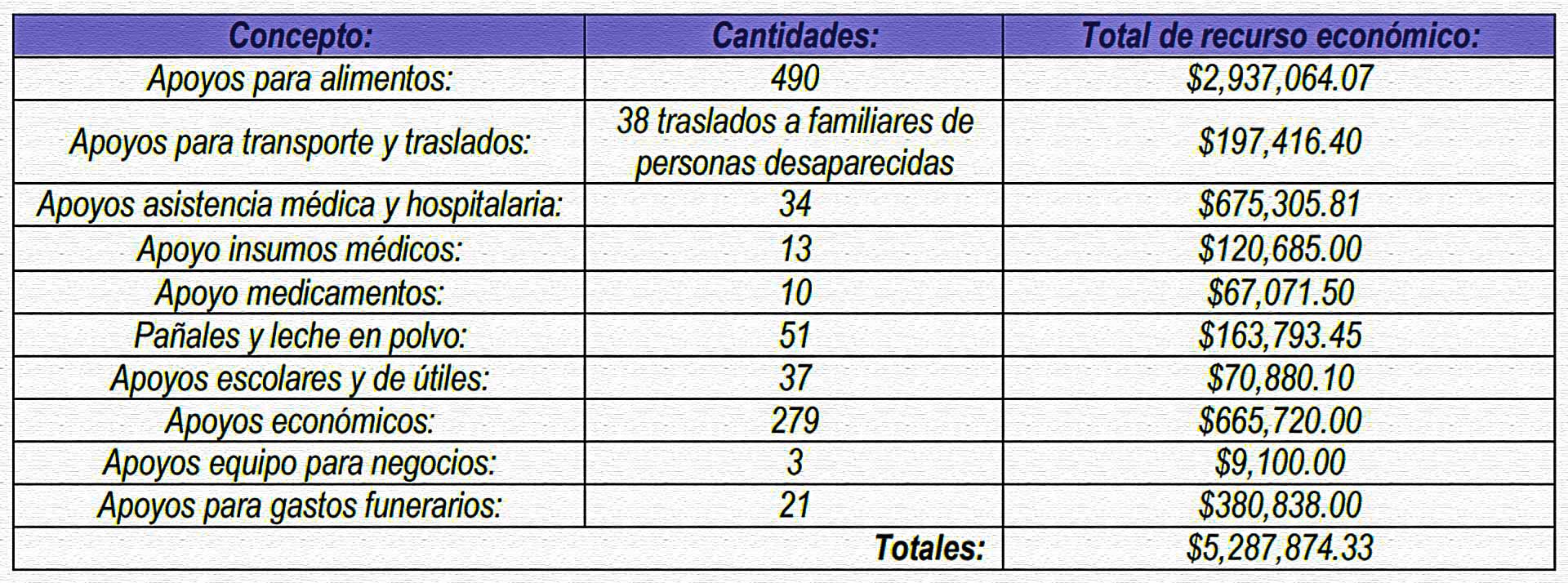 Dentro del rubro de “apoyos económicos” no se da mayor desglose, pero se deduce, y también por los testimonios de familiares en la entidad, que posiblemente hubo alguna entrega directa, monetaria: si dividimos el monto total por la cantidad obtenemos un promedio de 2,376 pesos para cada persona beneficiaria o núcleo familiar. Este tipo de apoyo ha resultado bastante “misterioso”, pues fue concedido durante las primeras semanas de la pandemia sólo a algunos grupos de personas y luego fue retirado, pues varios colectivos y familias no pudieron acceder a él, aun habiéndolo solicitado.
