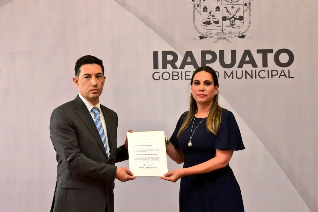 Ricardo Benavides, secretario de Seguridad Ciudadana y Lorena Alfaro, alcaldesa de Irapuato. Foto: especial.