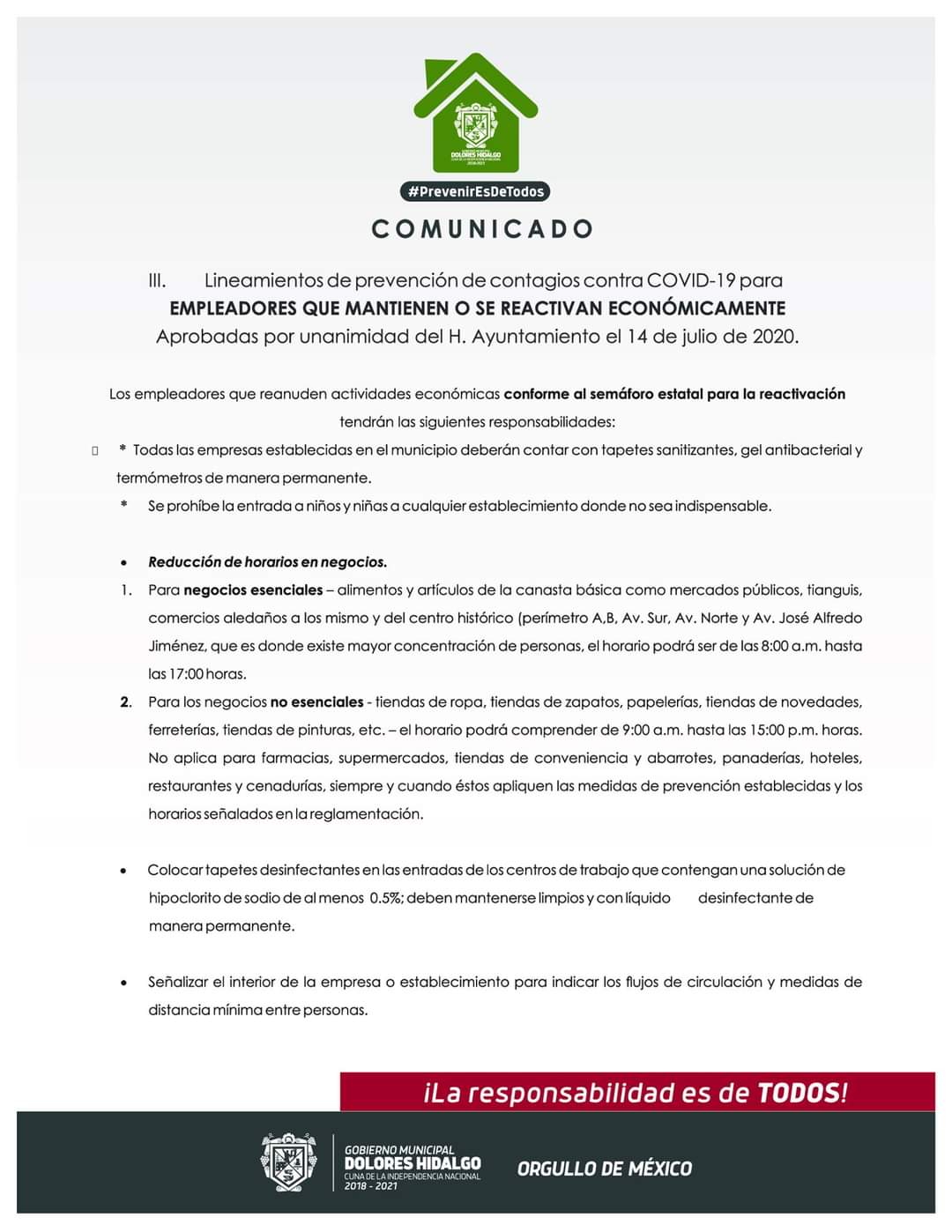 El pasado 14 de Julio, el ayuntamiento de la ciudad de Dolores Hidalgo emitía un comunicado, en el que señalaban los protocolos de reapertura para los negocios no esenciales como tiendas de novedades, ferreterías, pero en ningún momento se mencionan la reapertura de salones de eventos, o servicio de banquetes y meseros.
