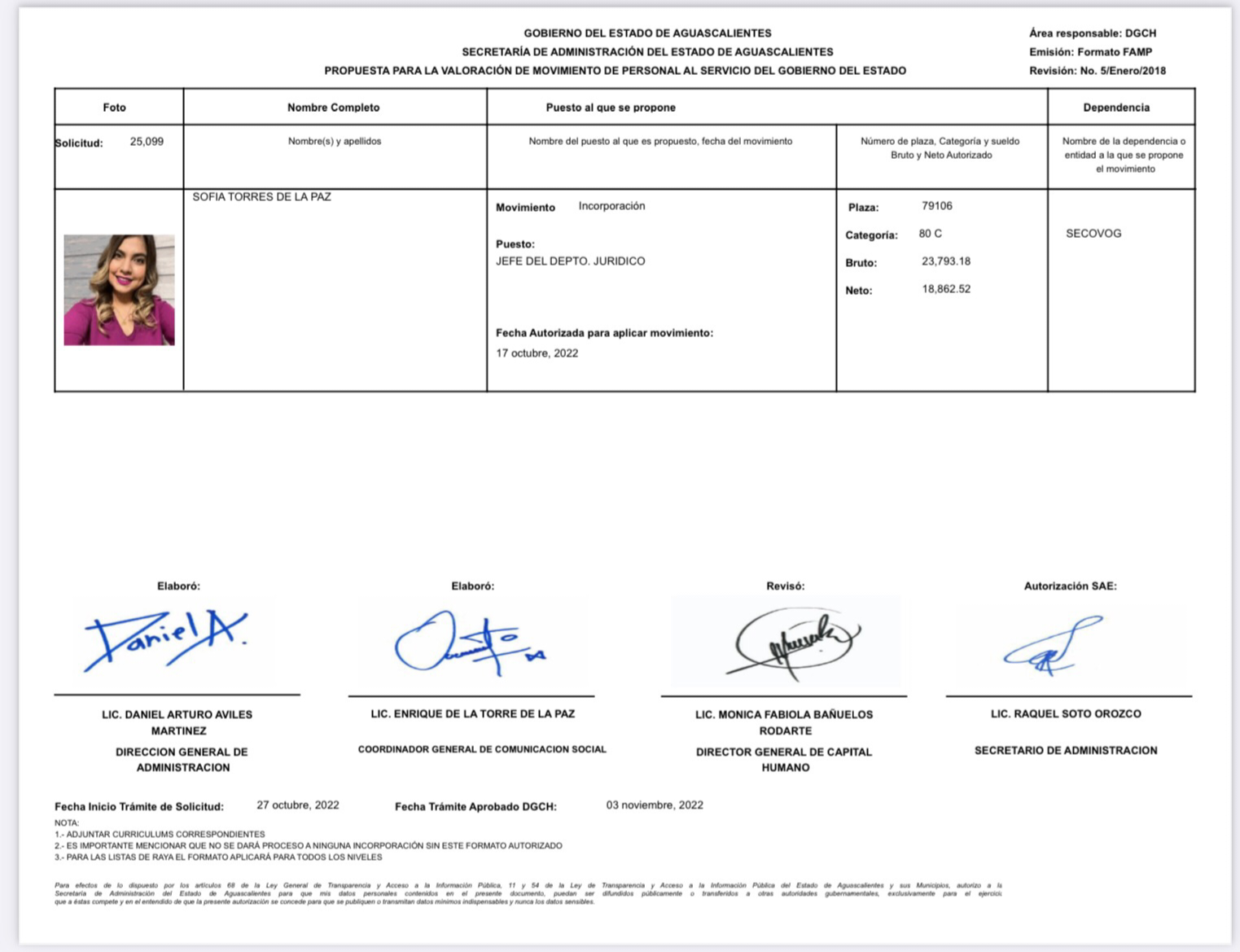 Como puede observarse en el documento de alta, que se publica a continuación, le cambiaron el apellido paterno a Sofía por el de “Torres” en lugar de “de la Torre”: ¿Fue producto de la reiterada ineptitud de los funcionarios? ¿Fue intencional para despistar a la transparencia? ¿Fue un grave error (horror) que debió tener consecuencias jurídicas y administrativas para la beneficiada?