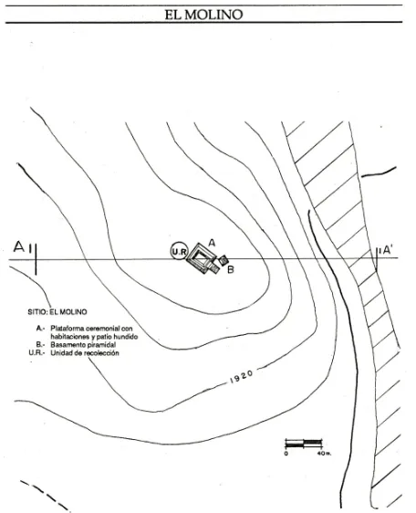 B.- El Romeral, muy cercano a Palo Blanco, en el cual Ramos describe tres pequeñas plataformas, las cuales ya no existen. No pudimos localizar nada.