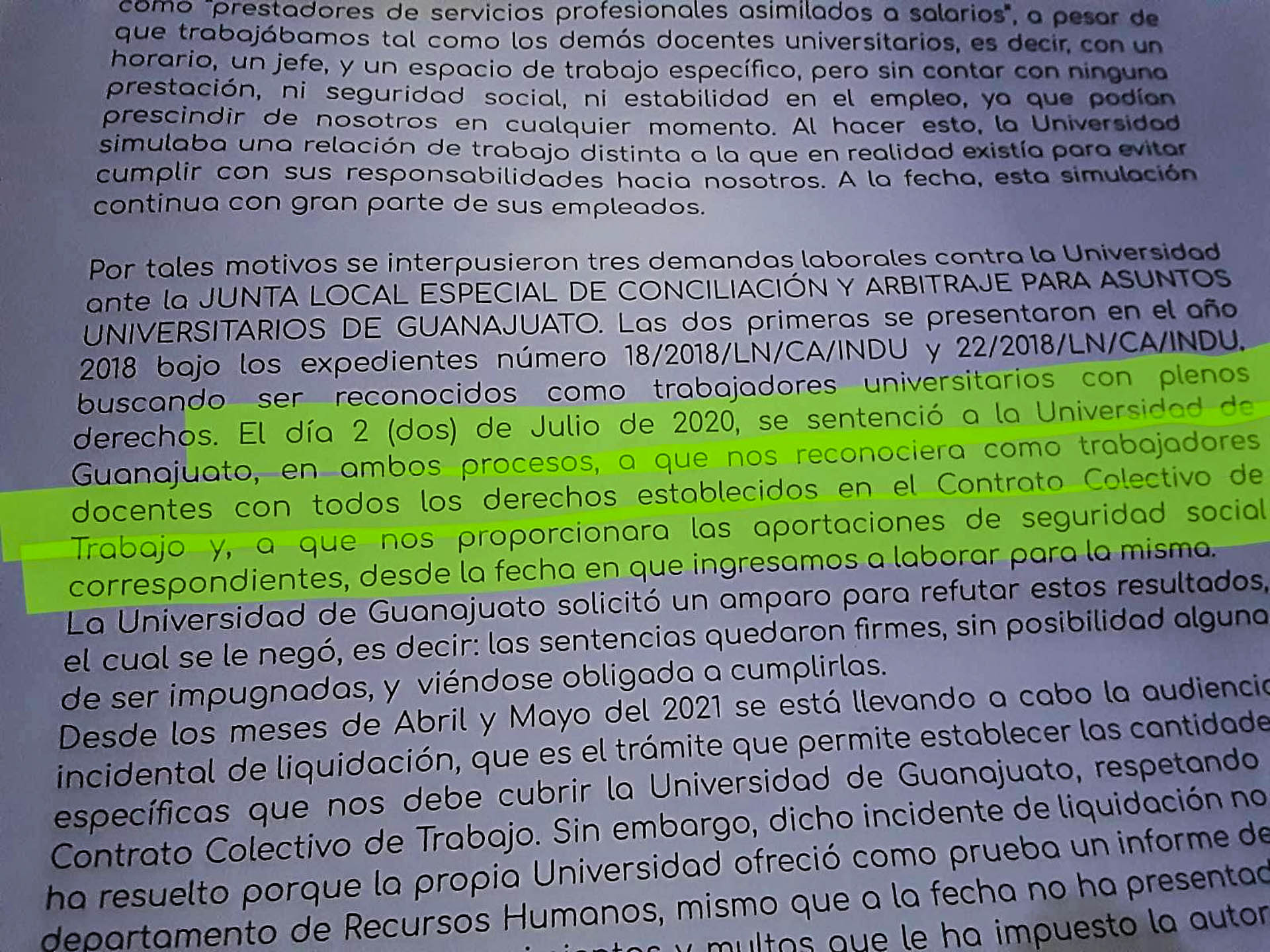 Mencionaron que esto ocurre luego de una lucha de muchos años, primero con solicitudes internas ante las instancias universitarias y ante el propio rector para el reconocimiento de sus derechos laborales, lo que al final derivó en tres demandas ante la Junta Local Especial de Conciliación y Arbitraje para Asuntos Universitarios de Guanajuato.
