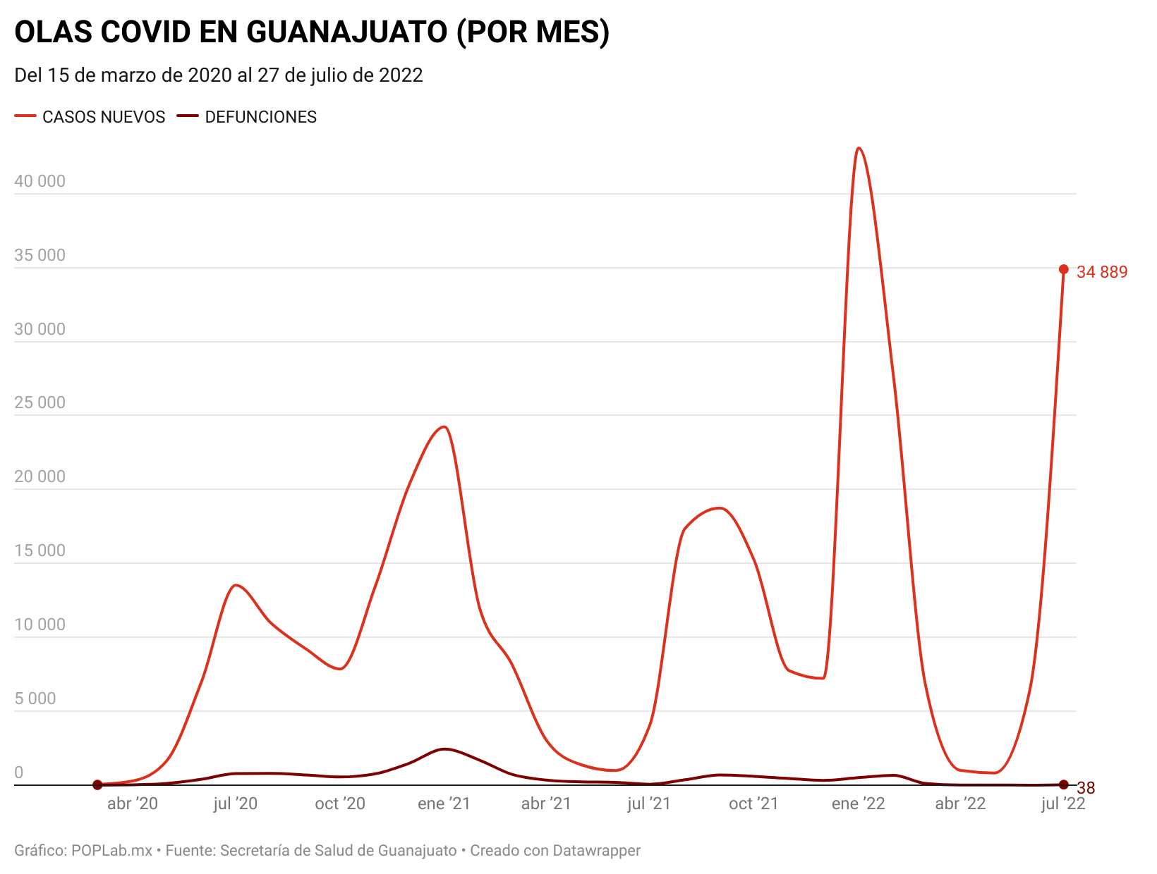 Guanajuato se encuentra en plena ola de contagios COVID, la quinta: este miércoles la entidad reportó un nuevo máximo histórico de casos nuevos por día, 2 mil 332. Y aunque las cifras de defunciones y hospitalizaciones del día siguen siendo bajas, 1 y 55 respectivamente, estas también presentaron un incremento sustancial respecto a los acumulados de semanas anteriores.