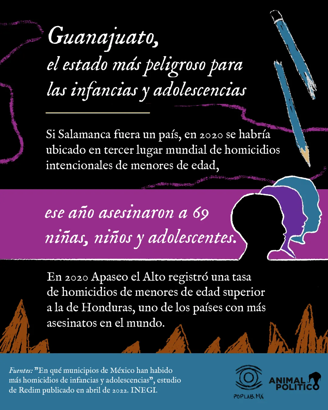 Entre 2008 y 2010 cuando la llamada guerra contra el narcotráfico del entonces presidente de México, Felipe Calderón Hinojosa, desató la violencia homicida en el país, Sinaloa reportó 157 homicidios de menores de edad, según refiere en su libro “Los morros del narco", el periodista Javier Valdez. 10 años después, el mismo estado reporta entre 2018 y 2020 un total de 170 asesinatos violentos de niñas, niños y adolescentes. En contraste, Guanajuato supera en un 600 por ciento los homicidios dolosos en este grupo de edad.