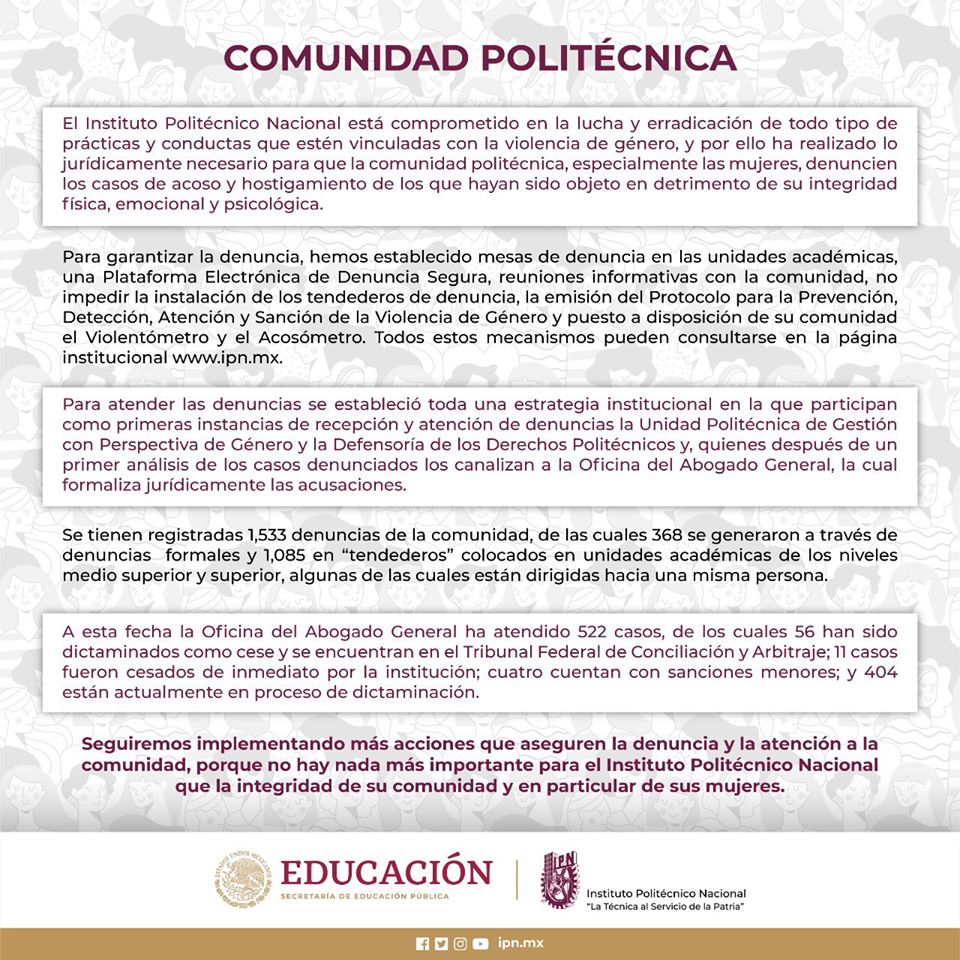 Sin embargo, exhortó a la comunidad a conocer las primeras conclusiones de autoridades centrales del IPN luego de tomar acciones contra el acoso, que se aceleraron desde el pasado mes de noviembre, pero con la intensión, en primer lugar, de no revictimizar, pero con la idea de avanzar y de resolver, algo que solamente se logrará con denuncias formales.