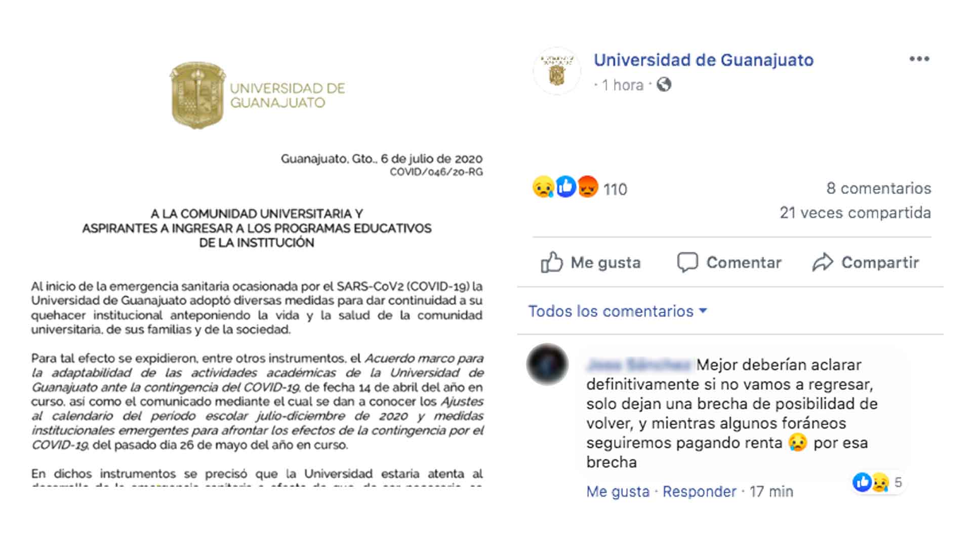 ¿Cómo y cuándo podrán presentar examen los aspirantes a nuevo ingreso? ¿Qué pasará con los programas educativos donde las prácticas y los laboratorios son imprescindibles? ¿Se pagará inscripción completa? ¿Qué pasará con las prácticas profesionales y el servicio social?, son algunos de los cientos de cuestionamientos que se hacen estudiantes en la publicación del comunicado que hizo la UG en el perfil de Facebook.